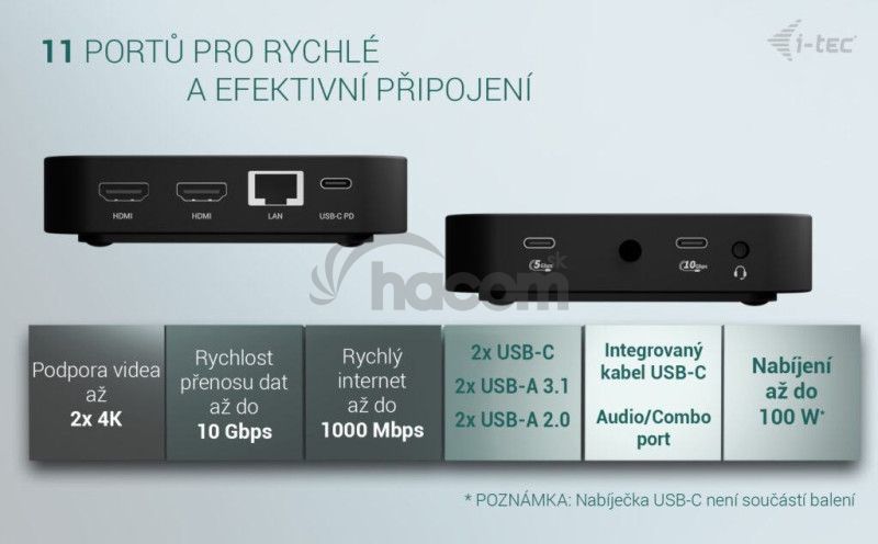Poznámka: Napájací adaptér nie je súčasťou balenia. Dokovaciu stanicu je možné napájať pomocou originálneho napájacieho adaptéra notebooku, alebo je možné dokúpiť voliteľný napájací adaptér (i-tec kód: CHARGER-C100W/UK).