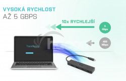 USB-C a Thunderbolt "3 či 4 sú na dnešných notebookoch a tabletoch čím ďalej populárnejší. Spoločne s ich čím ďalej širšom využívaní ubúda na tele notebookov množstvo USB portov. A ak potrebujete pripojiť k svojmu zariadenia príslušenstvo, na ktoré už nemáte dostatok portov, môžete využiť tohto malého, ale šikovného rozbočovače.S týmto hubom získate ďalšie 4 ďalšie USB: dva štandardné USB 3.0, a dva USB-C porty. Pripojte si externú klávesnicu a myš, prenášajte dáta alebo filmy z USB flash disku rýchlosťou až 5 Gbps alebo nabíjajte svoje mobilné zariadenia nabíjajte (štandardné USB rýchlosťou 0.9A).