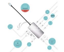 Malá kovová USB-C dokovacia stanica, ktorá dokáže ľahko pripojiť externý monitor či projektor, a to prostredníctvom portu HDMI alebo VGA. Jednoducho pripojte váš notebook či tablet (inštalácia ovládačov nie je nutná) a využite rýchleho dátového USB, pripojenie k internetu prostredníctvom LAN portu, spolu s možnosťou pripojiť vaše slúchadlá a mikrofón. Samozrejmosťou je podpora napájania vášho notebooku, a to až do 100 W, čo znamená, že budete schopní nabiť všetky notebooky a tablety, ktoré nabíjanie prostredníctvom USB-C (USB-C Power Delivery) podporujú.