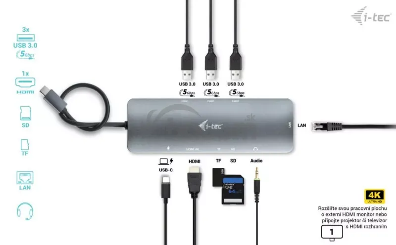 Rozšírte svoju pracovnú plochu o externý HDMI monitor alebo pripojte projektor či televízor s HDMI rozhraním. Dokovacia stanica podporuje prenos Ultra HD 4K videa s rozlíšením až 3840×2160@60Hz vrátane audio signálu.