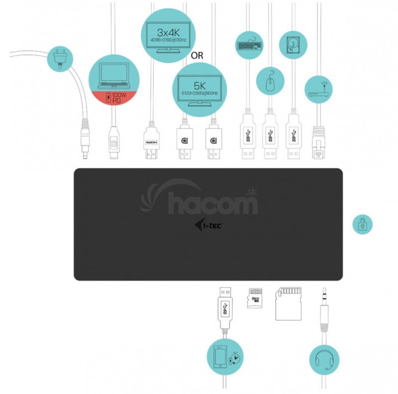 Dokovacia stanica USB-C s podporou až troch externých monitorov v rozlíšení 4K, ktorá podporuje akýkoľvek notebook s operačným systémom Windows 10. Integrovaný najnovší protokol DL 1.4 DSC podporuje taktiež rozlíšenie 5K/60 Hz, čo z tejto dokovacej stanice robí ideálneho spoločníka pre profesionálne grafiky , dátových analytikov, filmových editorov alebo milovníkov videa vo vysokom rozlíšení.Jednoducho pripojte váš notebook či tablet (inštalácia ovládačov nie je nutná) a využite rýchly dátový prenos cez porty USB 3.0 či cez porty SD a microSD, a nabite si váš chytrý telefón či tablet vďaka integrovanému USB portu s nabíjacím výkonom až 10 W.