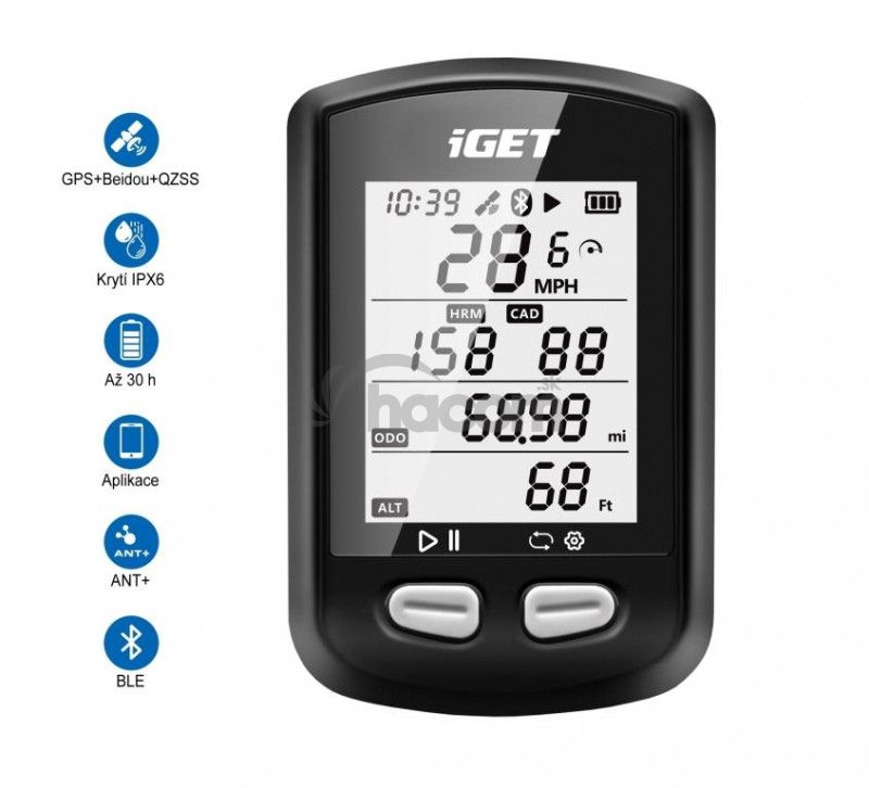 Cyklocomputer - 1,8" čiernobiely displej, batéria až 30 hodín, bezdrôtový, GPS/BedDou/QZSS, výškomer, teplomer, výpočet kalórií, funkcia automat. nastavenie času a jasu, meranie rýchlosti, priemernej rýchlosti, maximálnej rýchlosti, meranie prejdenej vzdialenosti, meranie vzdialenosti, meranie celkového času jazdy, meranie času pohybu, počítanie okruhov atď., možnosť pripojenia senzorov rýchlosti SPD, kadencie CAD a srdcového tepu HR cez ANT+, vodeodolný IPX6, Bluetooth, USB, podpora Androidu a iOS, podpora SK, SK, PL , HU jazyka v APP, rozhranie zariadenia v EN, podpora APP GPS Bike, Strava a Training Peaks, podpora OTA, držiak súčasťou balenia, kompatibilný s elektrobicyklami, hmotnosť 59 g, 75x48x20 mm, pamäť 250 h.Technické parametre