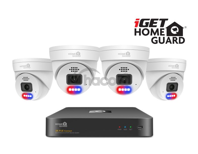 Kamerový systém iGET HOMEGUARD HGNVK84804 s rozlíšením Super HD 2K (2560 x 1440), obojsmerným prenosom zvuku, farebným nočným videním, sirénami, PoE napájaním a SMART detekciou pohybu. 8-kanálový 2K rekordér NVR s PoE napájaním + 4x HGNHK937CAM 2K (4MPx) PoE farebná vonkajšia kamera s LED svietením a výstražnými LED, myš, kabeláž, pozícia pre 1x HDD SATA až 10 TB, podpora ONVIF ver.2.6.Kamerový systém iGET HOMEGUARD HGNVK84804 s rozlíšením Super HD 2K (2560 x 1440), SMART detekciou pohybu, obojsmerným prenosom zvuku, sirénami, a PoE napájaním (pre napojenie kamier k rekordéru sa využíva univerzálny Ethernet kábel pre Cat.5e, Cat. 8-kanálový 2K rekordér NVR s PoE + 4ks 2K (4MPx, 2560 x 1440) PoE farebných vonkajších kamier iGET HOMEGUARD HGNHK937CAM. Vodeodolné kamery s IP66 krytím obsahujú IR LED nočný prísvit (dosah až 35m), LED svetlá pre farebné nočné videnie (dosah až 25m), výstražné policajné LED majáky, mikrofón, reproduktor a sirénu na výstrahu. Moderná kompresia videa H.265, Gigabitový port RJ45 pre pripojenie na Internet, pozícia pre 1x HDD SATA (max. 10 TB), konektory 9x LAN, 2x USB, VGA, HDMI, Audio CINCH. Mobilné aplikácie (Android/iOS) a PC (Windows/MAC) pre vzdialené online sledovanie + pripojenie k TV/monitoru. USB myš, 4x 18m Ethernet kábel, varovné nálepky, manuál v CZ/SK/PL/EN. Podporuje ONVIF ver.2.6.