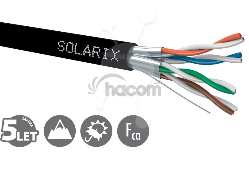popisTento inštalačný kábel z produktovej rady Solarix - kategórie 6A s označením SXKD-6A-STP-PE je vonkajšia tienený kábel, ktorý je určený pre náročnejších inštalácie, kde bežný dátový kábel s PVC alebo LSOH plášťom neposkytuje dostatočnú ochranu proti vplyvom okolitého prostredia. Kábel bez problémov spĺňa a tiež prevyšuje požiadavky špecifikované v medzinárodných štandardoch ANSI / TIA 568, ISO / IEC 11801 a EN 50173 pre kategóriu 6A resp. triedu vedenie Class EA, vrátane všetkých najnovších dodatkov. Vodiče kábla sú vyrobené z kvalitného medeného drôtu vo veľkosti AWG 23 s polyetylénovou izoláciou a sú testované až do šírky pásma 500 MHz. Jednotlivé páry sú tienené samostatne hliníkovou fóliou, typ plášťa je UV stabilný PE (trieda reakcie na oheň FCA). Farba kábla je čierna. Kábel SXKD-6A-STP-PE je značený priebežnú metráží po 1 ma je dodávaný na vysoko pevné drevené cievke, na ktoré sú uvedené všetky potrebné produktové informácie, vrátane čiarových kódov, výrobné šarže, popisu a najdôležitejších technických parametrov. Pri inštalácii do zeme odporúčame vždy použiť HDPE chráničku.