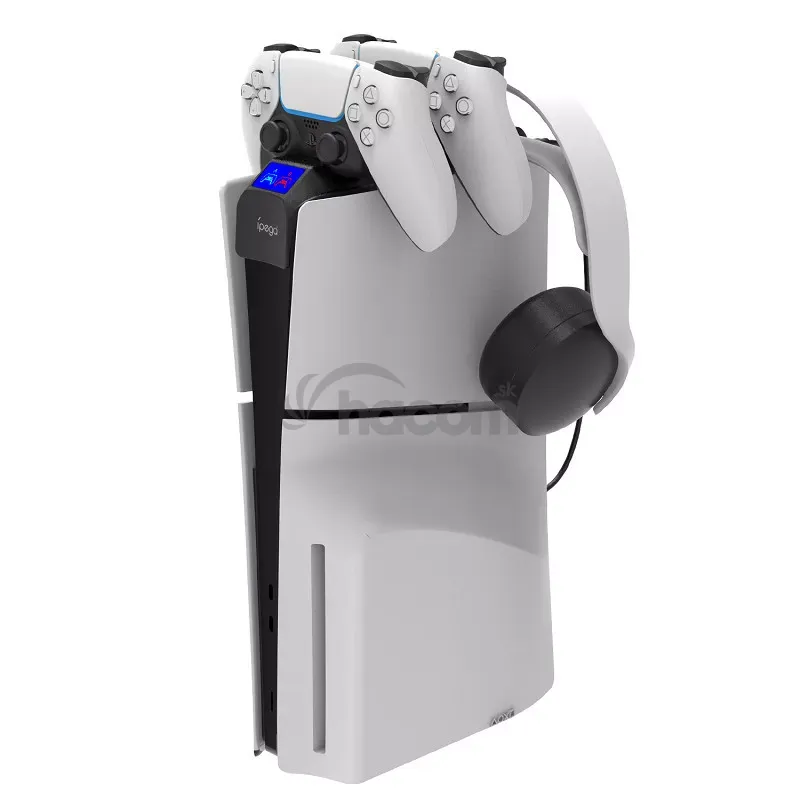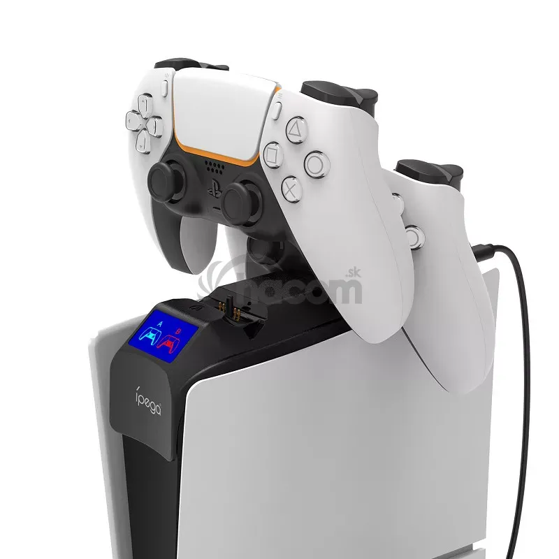 Nabíjacia stanica iPega P5S016 určená pre 2 Playstation DualSense ovládače s držiakom na slúchadlá as inštaláciou priamo na hernej konzole Playstation 5.Inštalácia je veľmi jednoduchá, pretože ju stačí iba nasadiť na vrchnú stranu konzoly a pripojiť USB káblom. Na prednej časti sa nachádza LED indikácia stavu nabitia jednotlivých ovládačov a na zadnej časti nájdete držiak pre slúchadlá.