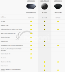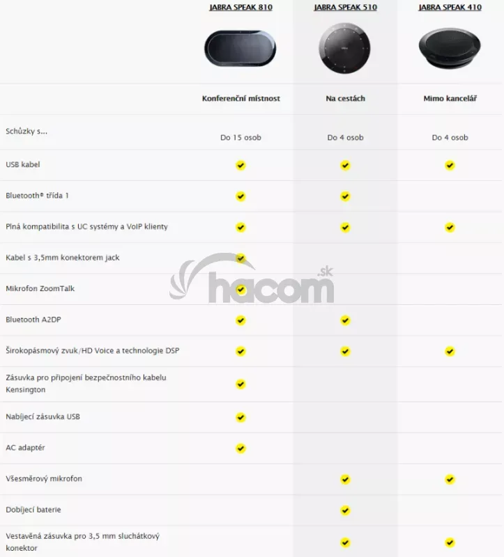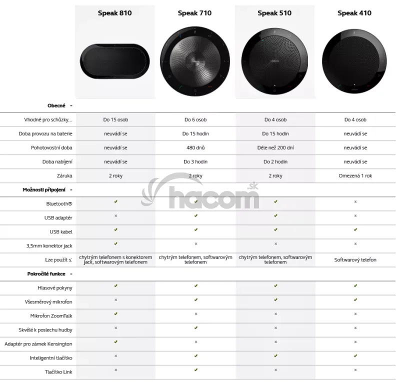 - Jabra SPEAK 510: rovnaké funkcie ako 410, navyše obsahuje Bluetooth pre prepojenie k tabletu / smartphone