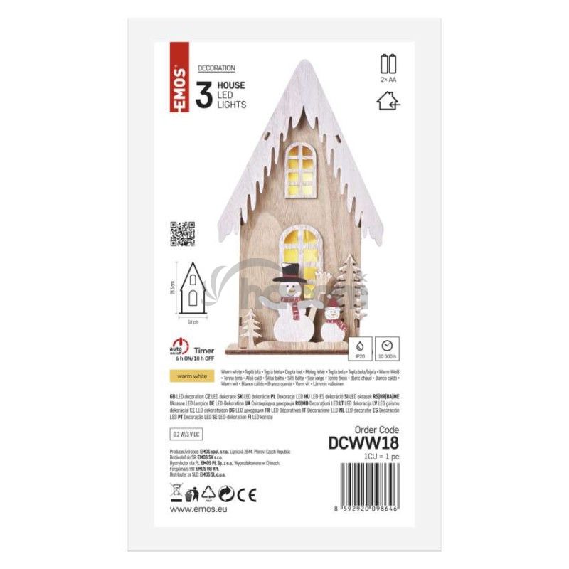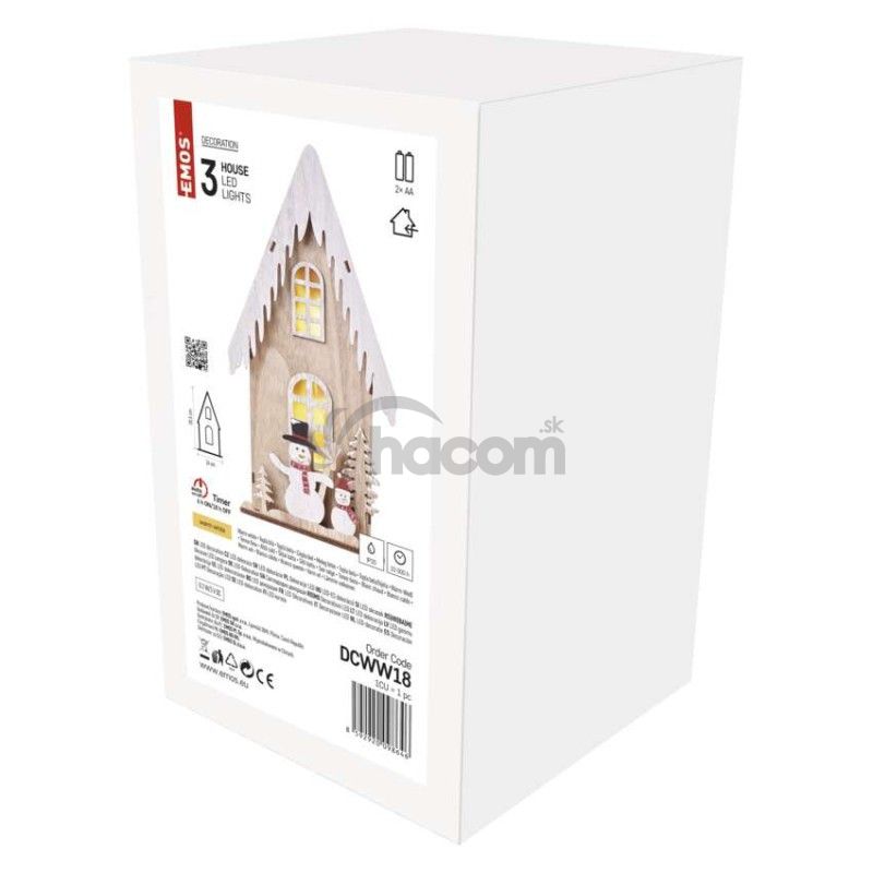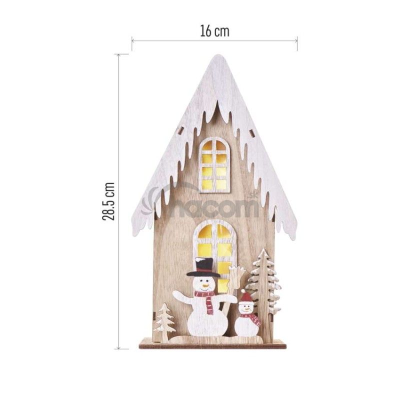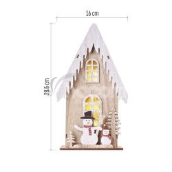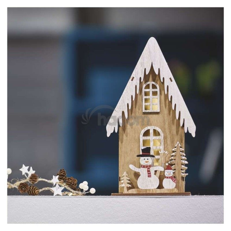 - LED dekor. drevená – dom so snehuliakmi, 28,5 cm, 2x AA, vnútorná, teplá biela, časovač DCWW18