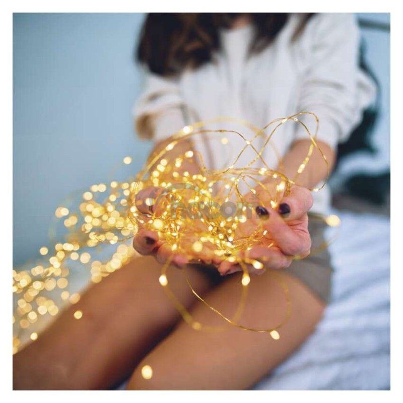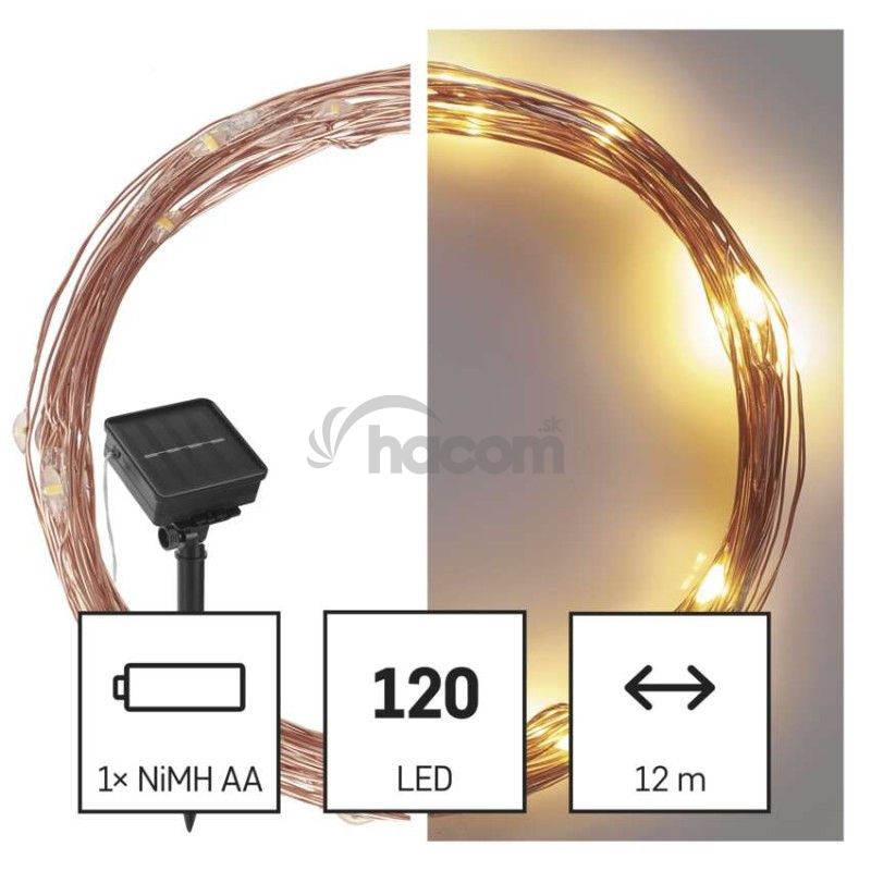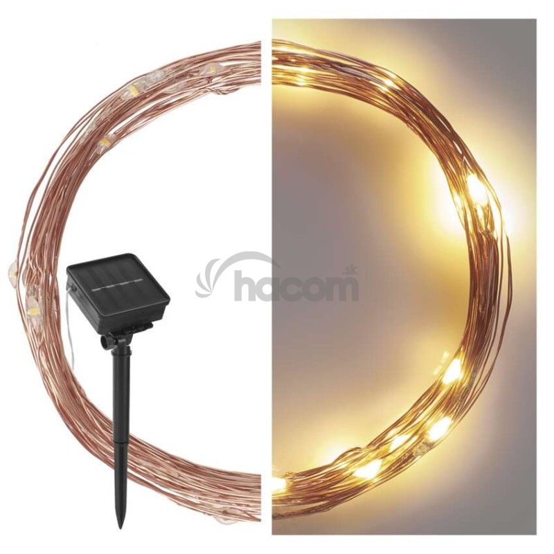 - LED nano reťaz so solárnym panelom, medená, 12 m, vonkajšia aj vnút., teplá biela, časovač D3ZW01