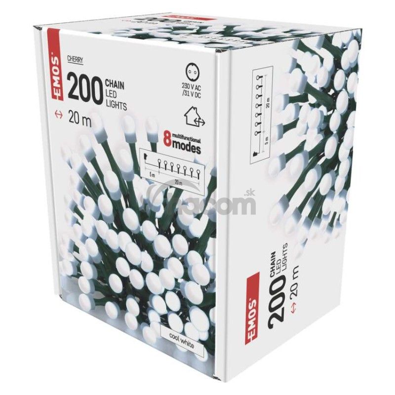 - LED vianočná cherry reťaz – guličky, 20 m, vonkajšia aj vnútorná, studená biela, programy D5AC07