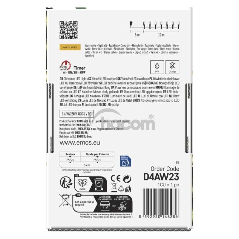 - LED vianočná reťaz, 12 m, vonkajšia aj vnútorná, teplá biela, programy, časovač D4AW23