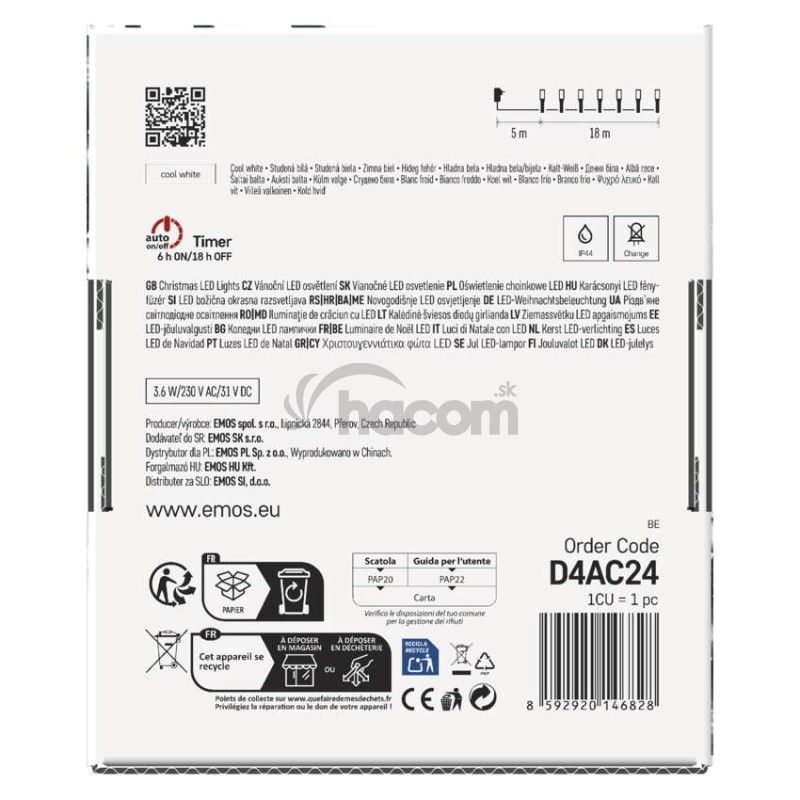 - LED vianočná reťaz, 18 m, vonkajšia aj vnútorná, studená biela, programy, časovač D4AC24