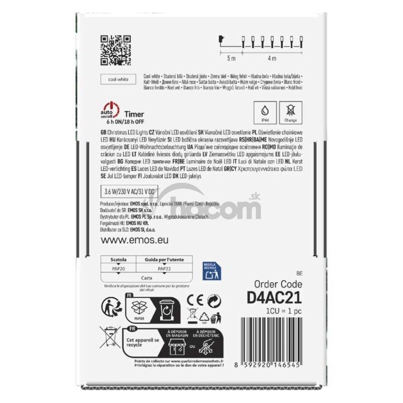 - LED vianočná reťaz, 4 m, vonkajšia aj vnútorná, studená biela, programy, časovač D4AC21