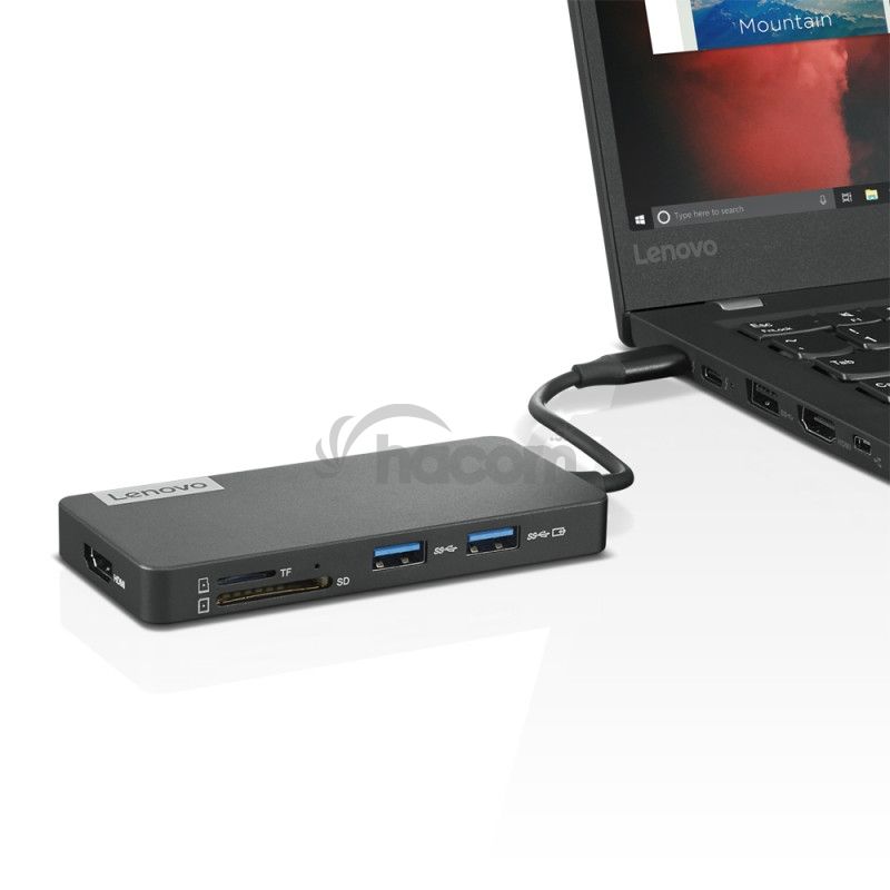 Lenovo USB-C 7-in-1 HubRozbočovač Lenovo USB-C 7 v 1 je vašou vstupenkou na maximálne využitie každého dobrodružstva. S jedným prenosným rozbočovačom môžete na cestách nabíjať všetky svoje zariadenia USB. Okrem nabíjania ho môžete používať aj ako rozbočovač pripravený na cesty, ktorý vám umožní umiestniť až 7 rozširujúcich portov do jediného kábla USB-C a bez námahy ho prenášať so sebou do všetkých vašich obľúbených destinácií.