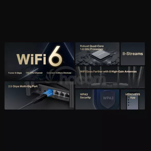 MR90X AX6000 Dual-Band Wi-Fi 6 RouterSPEED: 1148 Mbps at 2.4 GHz + 4804 Mbps at 5 GHz /LAN auto-sensing), 2× Gigabit LAN Ports, 1024-QAM, OFDMA, HE160FEATURE: MERCUSYS APP, Router/Access Point Mode, WPS/Reset Button, IPTV, IPv6, Smart Connect, Beamforming, MU-MIMO, Parental Controls , Guest Network, Qos, VPN Server, DFS, WPA3, BSS Color, TWT, TR-069, ISP Preset (Agile Config), Aginet ACS, Superadmin, EasyMeshParametre