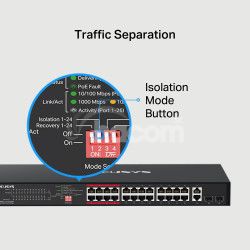 Switch naďalej ponúka režimy Isolation a Priority pre stabilný a bezpečný prevádzku a funkciu PoE Auto Recovery pre automatický reštart nezodpovedajúcich PoE zariadení.