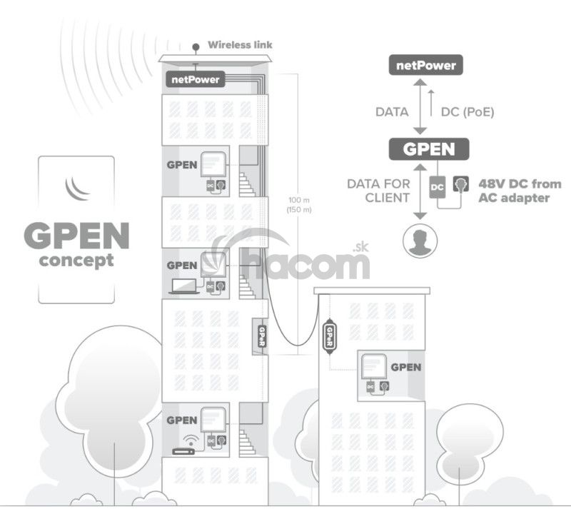 GPEN21 tak prostredníctvom PoE sprostredkováva napájanie ISP routera/switcha vonkajšie inštalovaného na objekte.