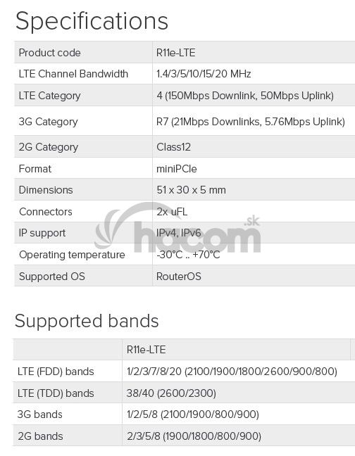 2G / 3G / 4G / LTE miniPCI-e modul od výrobcu Mikrotik podporujúci pásma 1/2/3/5/7/8/20/38/40 MHz.K nasadeniu s celou modelovou radou Mikrotik RouterBOARD s RouterOS (okrem RB800).