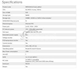 Disponuje integrovaným 64 GB SSD diskom, redundantným zdrojom. Okrem dvojitého napájanie má ešte DC vstup a podporuje ako pasívne tak aj aktívne PoE napájané v štandarde 802.3at.