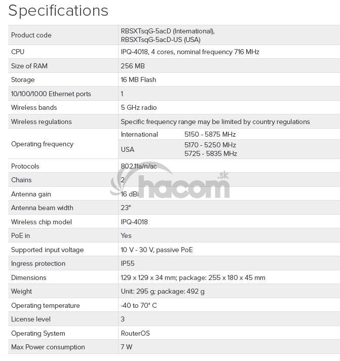 Outdoor jednotka s integrovaným 5GHz 802.11ac rádiovým modulom a vrátane systému RouterOS Mikrotik V6 L3.