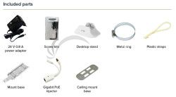 Súčasťou balenia je napájací zdroj, držiak, stojan a bezpečnostnú skrutku eliminujúce riziko neoprávneného vniknutia do zariadenia.