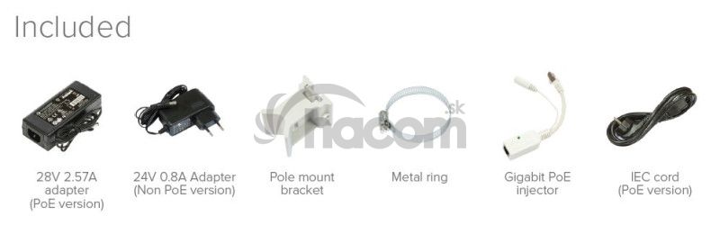 Súčasťou dodávky napájací zdroj, PoE injektor a montážne príslušenstvo.