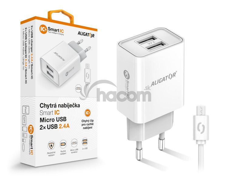 - Múdra sieťová nabíjačka ALIGATOR 2,4A, 2xUSB, smart IC, biela, micro USB kábel CHA0041