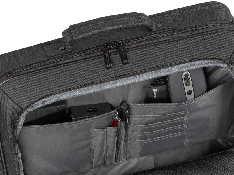 - V prednej priehradke sú dve zasúvacie vrecká na elektroniku, kancelárske príslušenstvo.