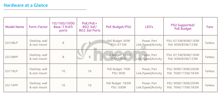 Model Description : GS116PP 16-port PoE+ Gigabit Ethernet Unmanaged switch with 183W total power budget