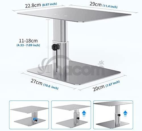 Popis produktu: Nillkin HighDesk nastaviteľný stojan pod monitor z vysoko kvalitného leteckého hliníka. Aby ste sedeli rovno a nebolela vás chrbát alebo za krkom, je potrebné mať monitor počítača alebo notebooku vo výške očí. Zabudnite na rôzne doma vyrobené podložky, ktoré sú nestabilné, zaberajú na stole hromadu miesta av neposlednom rade nevyzerajú pekne.Nillkin predstavil tento praktický stojan na stôl s nosnosťou až 15kg vyrobený z vysokopevnostného hliníka.Výška je nastaviteľná v rozmedzí 110-180mm pomocou jednej skrutky na zadnej časti.Nie je nič jednoduchšie, povoliť, nastaviť a utiahnuť.Dostatočne stabilná základňa zaistí, že sa monitor na stole nebude klopať ani kývať. Navyše vďaka protišmykovým podložkám na spodu, bude držať na svojom mieste naozaj spoľahlivo. Stojanček vyniká vysokou pevnosťou, perfektným spracovaním a povrchom z pieskovaného hliníka s odolným anodizovaním. Obohaťte svoj pracovný stôl o tento štýlový stojan, Nillkin HighDesk je tou najlepšou voľbou. z vysokopevnostného leteckého hliníka - pod monitor alebo notebook - nastaviteľná výška 110 - 180mm - nosnosť až 15kg - jednoduché nastavenie výšky pomocou jednej skrutky - pieskovaný povrch s anodizovaním - stabilná základňa - protišmykové podložky na spodnej strane - štýlový doplnok pracovného stola