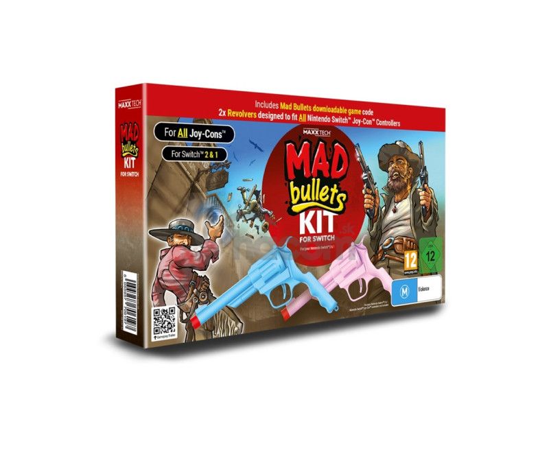 Kompatibilný s Nintendo Switch™ 2 a 1! Pre všetky ovládače Joy-Cons!Nová sada Mad Bullets Kit pre Nintendo Switch 2 a 1 obsahuje dva revolvery navrhnuté pre ovládače Joy-Con Nintendo Switch 2 a 1 a digitálny kód na stiahnutie hry Mad Bullets.