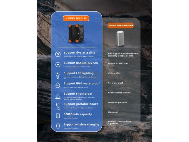 S našou outdoorovou powerbankou Viking SKADI III sa už nemusíte ničoho obávať. Táto vysoko odolná a výkonná powerbanka s kapacitou 30000 mAh/111Wh bola navrhnutá tak, aby vydržala extrémne podmienky a poskytla vám energiu, keď ju najviac potrebujete.
