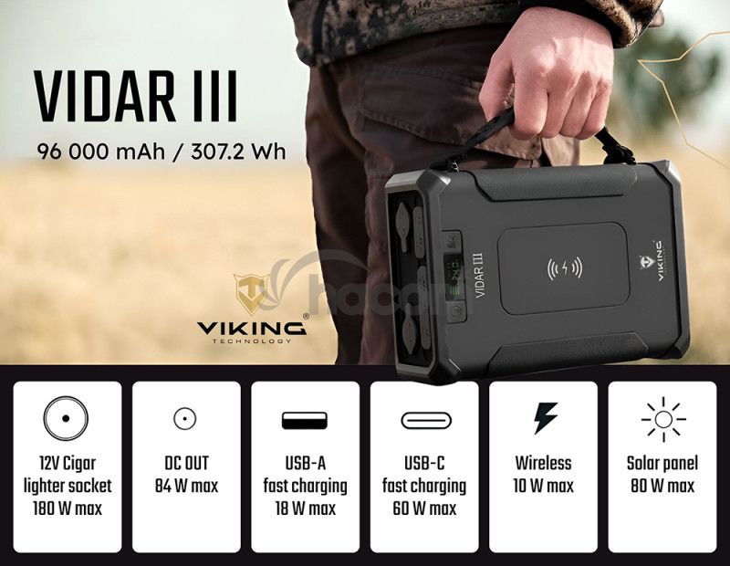 OUTDOOROVÁ POWERBANKA VIKING VIDAR IIIPredstavujeme vám outdoorovú powerbanku, ktorá je dokonalým spoločníkom pre vaše dobrodružstvo v prírode. S jej odolnosťou, vodeodolnosťou a obrovskou kapacitou 96 000mAh nebudete nikdy obmedzení. Užite si voľnosť a nezávislosť na elektrickej sieti a využite všetky výhody tejto výkonnej powerbanky pri svojich outdoorových aktivitách