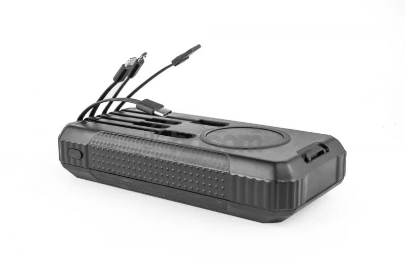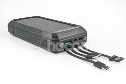 Powerbanka je veľmi odolná, po stranách vystužená nárazuvzdorným materiálom. V tele produktu sú umiestnené dve výkonné LED diódy s funkciami prísvit, SOS a stroboskop. Je tak skvelým parťákom k outdoorovému dobrodružstvu, kde vás vďaka veľkej kapacite batérie, solárnemu panelu, LED prísvitu a pevnej konštrukcii nenechá nikdy v štychu. Šikovným detailom je otvor pre šnúrku.