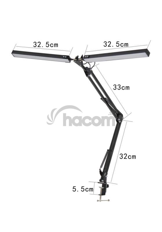 Dĺžka napájacieho kábla je 130 cm, čo poskytuje dostatočný priestor na umiestnenie lampy podľa potreby. Vďaka kombinovanej možnosti montáže si môžete zvoliť buď pevné uchytenie pomocou klipu na hranu stola (do hrúbky 6 cm), alebo stabilné umiestnenie na základňu. Obe varianty sú súčasťou balenia. Celkový vzhľad lampy podčiarkuje moderné čierne prevedenie z kombinácie kovu a plastu, prevádzková teplota je v rozmedzí 0-40 ° C a vyžarovací uhol činí 120 °, čo zaisťuje široký záber svetla bez ostrých tieňov. Adaptér aj napájací kábel je súčasťou balenia. Napätie napájania je 12V/2A.