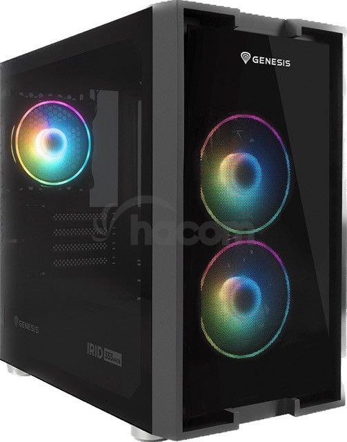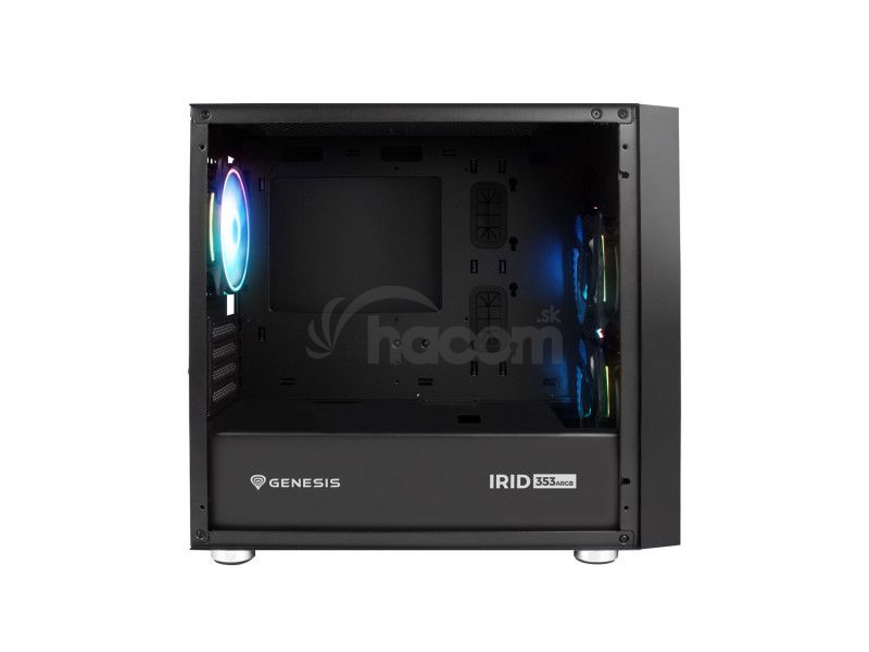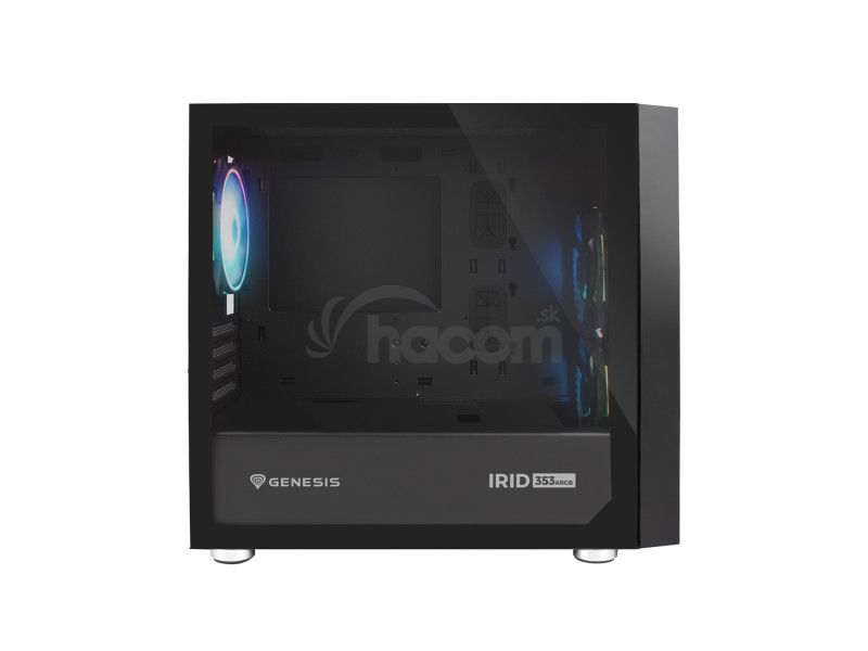 Počítačová skriňa Genesis Iride 353 MICRO. Iride 353 má predný a bočný panel z tvrdeného skla a 3 svetelnými ventilátory ARGB. Oba bočné panely sú umiestnené v tele skrine technológií slot-in, čo Iride 353 poskytuje elegantný a jednoduchý spôsob, ako sa dostať ku komponentom. V kombinácii s vysoko kvalitnými materiálmi, z ktorých je výrobok vyrobený, premieňajú bežnú PC skrinka na vizuálne ohromujúci dekoratívne kus. Skriňa poteší nielen funkčnosťou, ale aj elegantným štýlom.Model: Iride 353 ARGB MICRO
