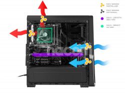 Používatelia, ktorí radi svoje vybavenie kontrolujú, ale aj tí, ktorí sa ním radi chvália, určite docenia priehľadné okno umiestnené v ľavej bočnici. Aby pod kapotou panoval poriadok, ktorý má veľký vplyv na správne prúdenie vzduchu, vnútorná konštrukcia skrine obsahuje špeciálne kanály za základnou doskou a montážne otvory, čo uľahčuje vedenie kabeláže. Skriňa je dodatočne vybavená spodným tunelom, ktorý oddeľuje zdroj od hlavnej komory, čo tiež významne zefektívňuje prúdenie vzduchu.