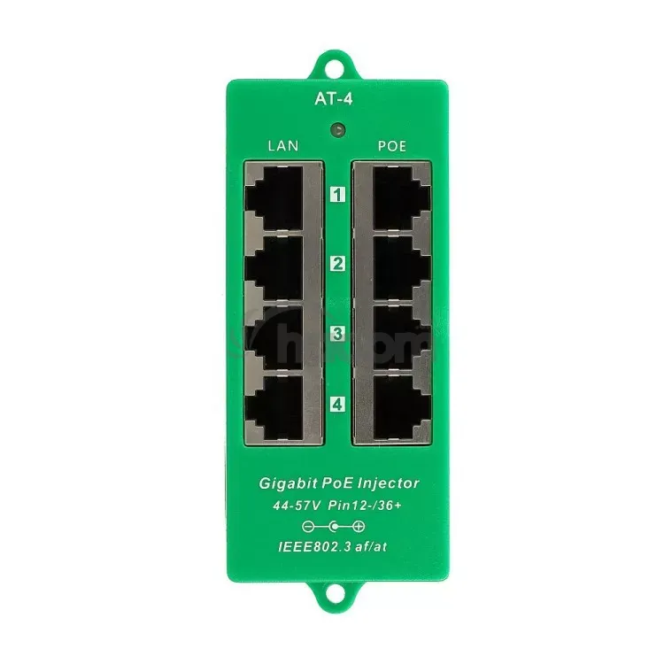 Panel integrujúci štyri gigabitové POE injektory s napájacím rozsahom 44-57V a max. výkonom až 25W/port s podporou štandardu 802.3af/at.Univerzálne riešenie pre vzdialené napájanie väčšieho počtu aktívnych prvkov s integrovaným extraktorom po UTP kabeláži.