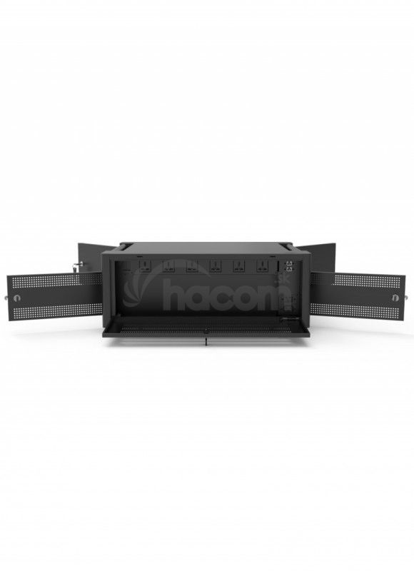 Zabezpečenie je optimálne vďaka zámku na kľúče s 3 uzamykacími bodmi. Je preto uzamknutý pomocou dodaných kľúčov, aby sa zabránilo krádeži, poškodeniu alebo zmene zariadenia. Elektrické zásuvky na zadnej strane modulu vám umožnia dobiť notebooky.
