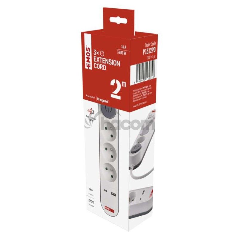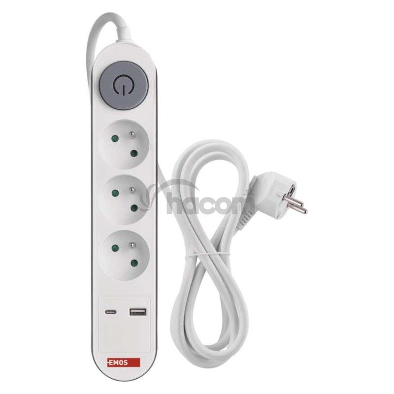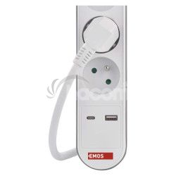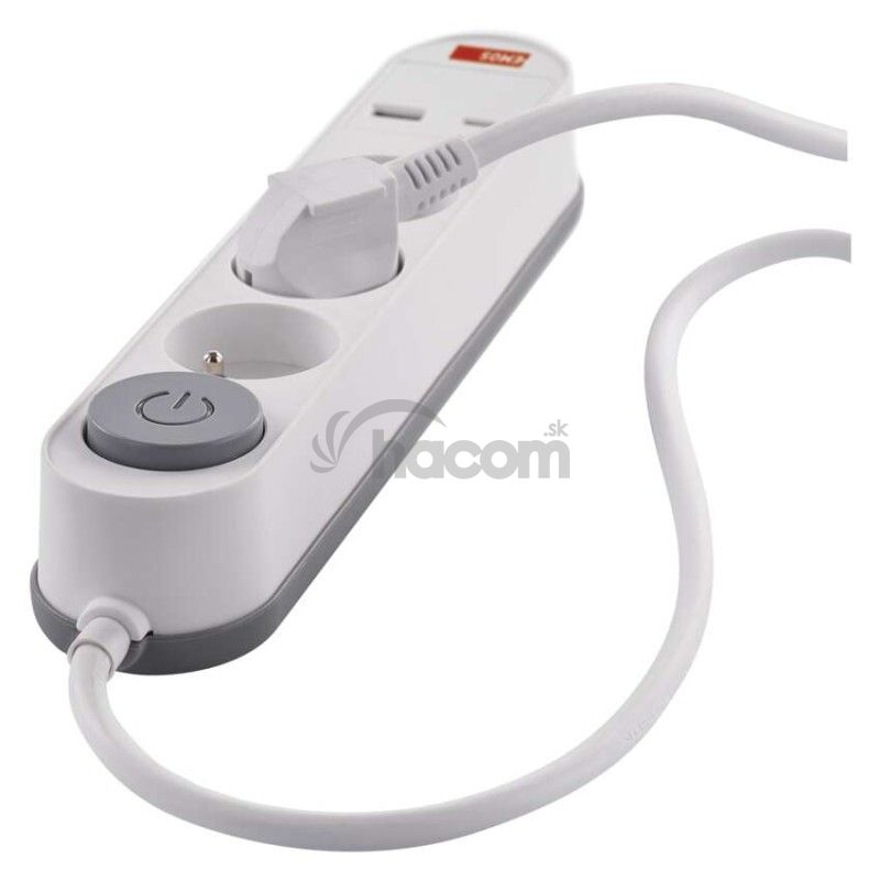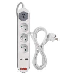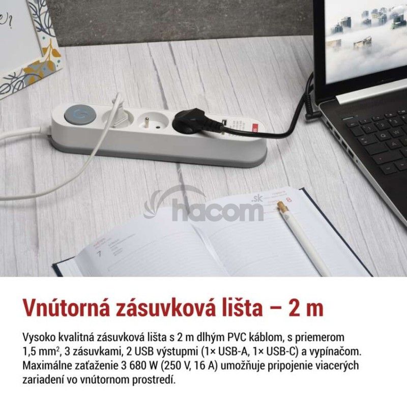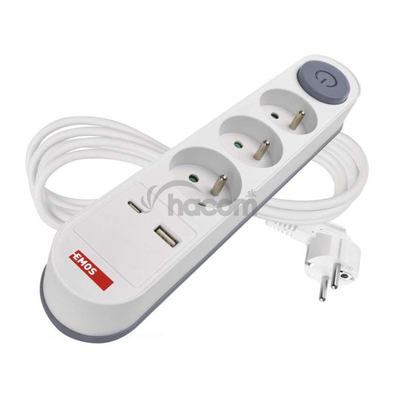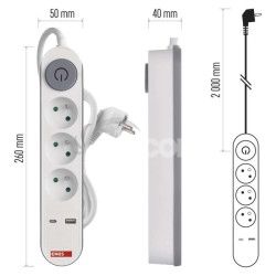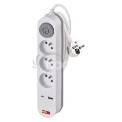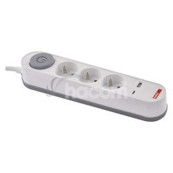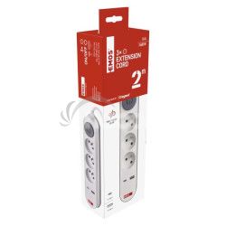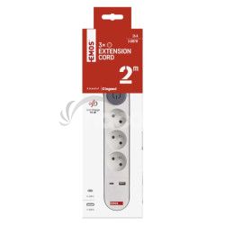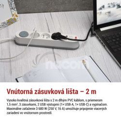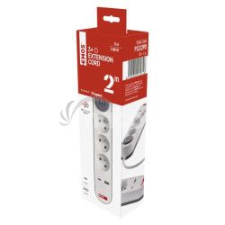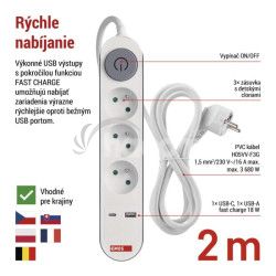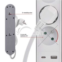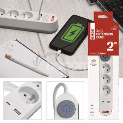 - Predlžovací kábel 2 m / 3 zásuvky / s vypínačom / biely / 1×USB-A + 1×USB-C / 1,5 mm2 P1312PD