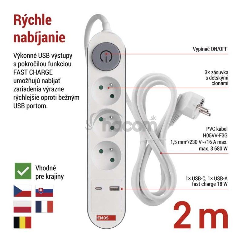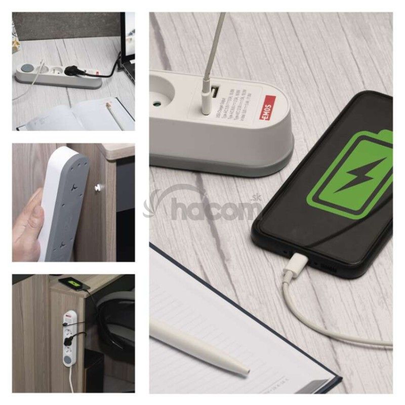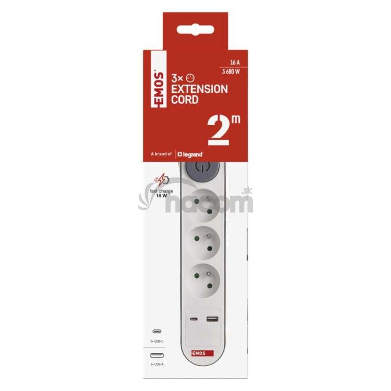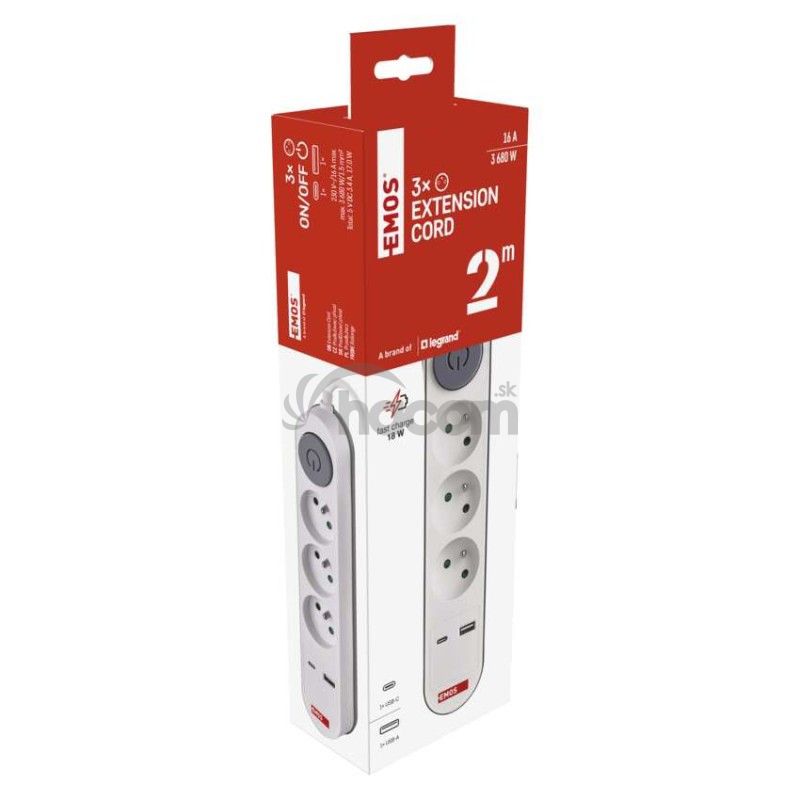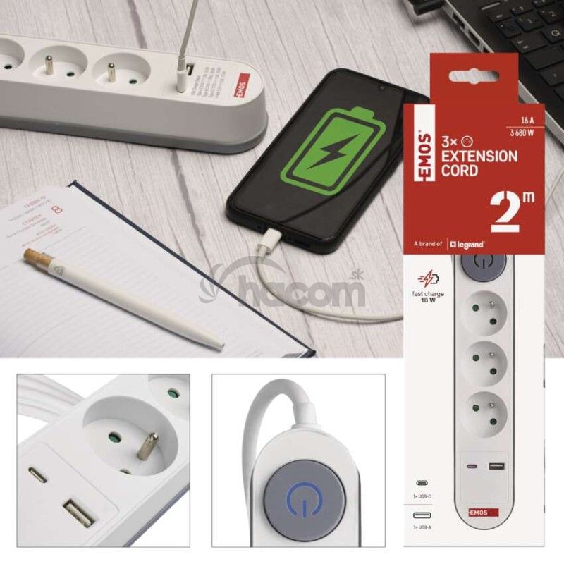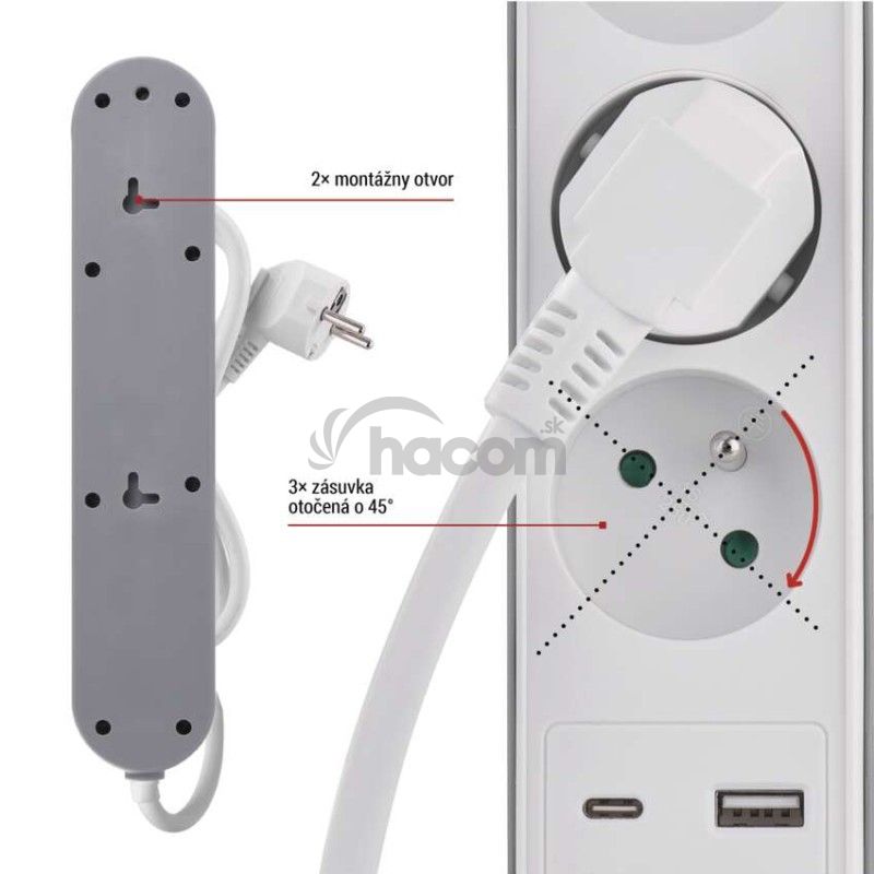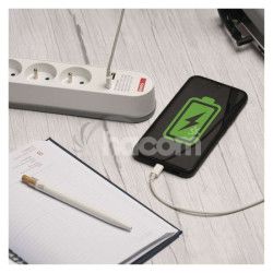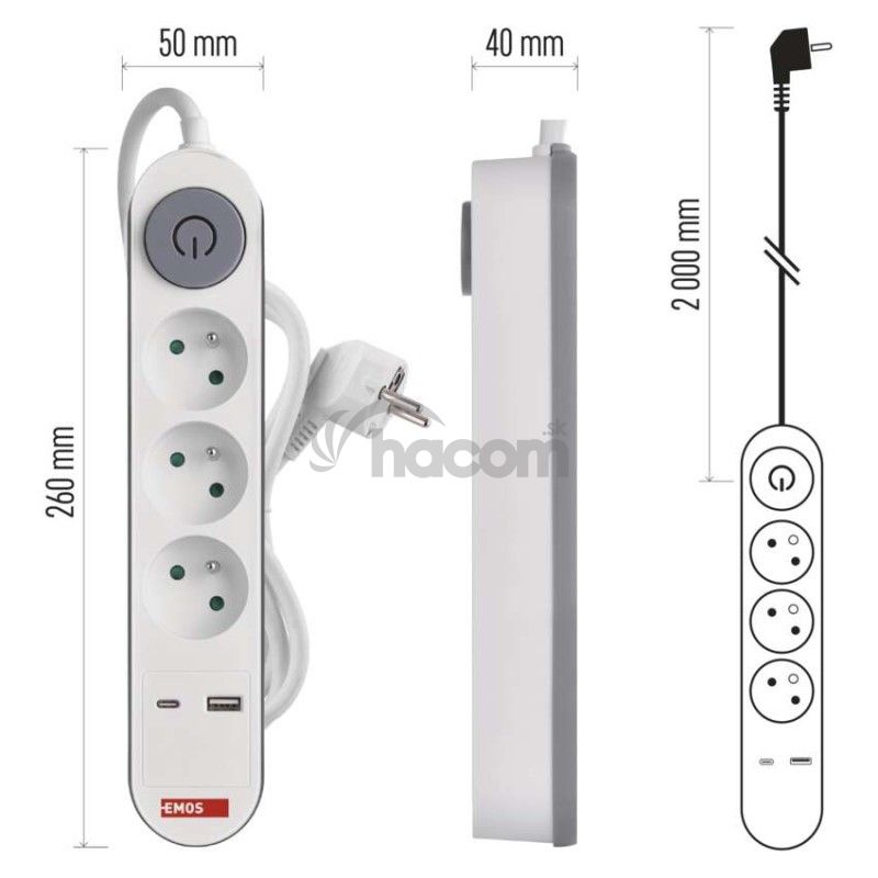 - Predlžovací kábel 2 m / 3 zásuvky / s vypínačom / biely / 1×USB-A + 1×USB-C / 1,5 mm2 P1312PD