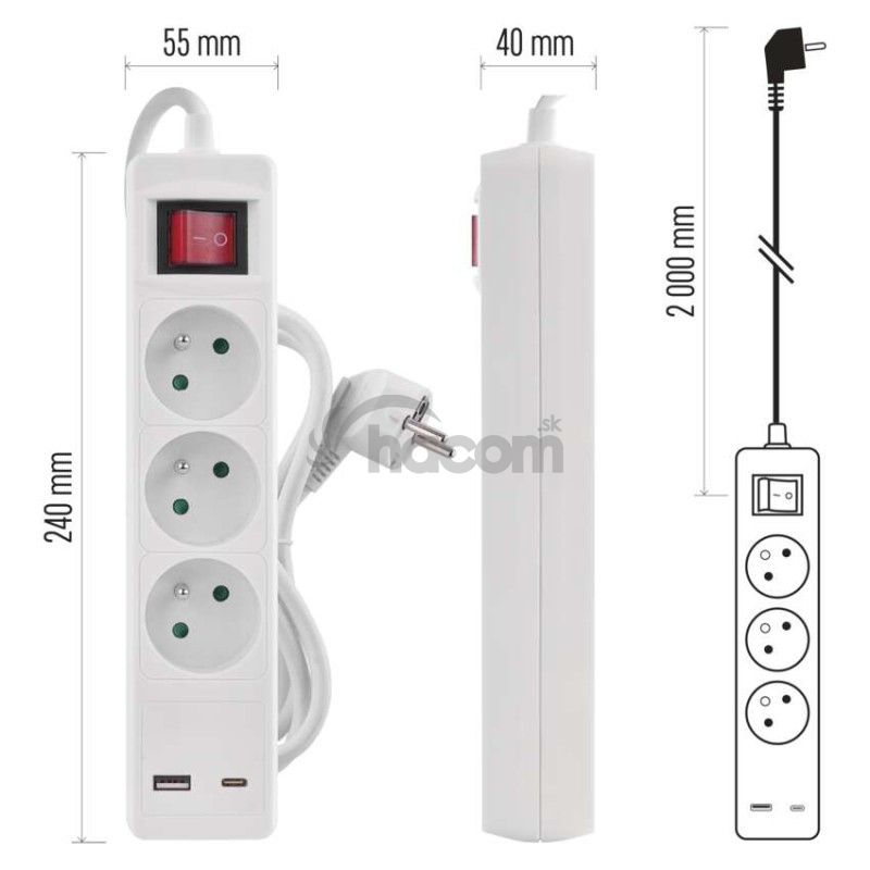 Predlžovací kábel 2 m / 3 zásuvky / s vypínačom / biely / 1×USB-A + 1×USB-C / 1,5 mm2 P1312CU