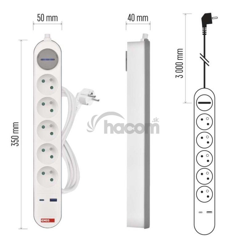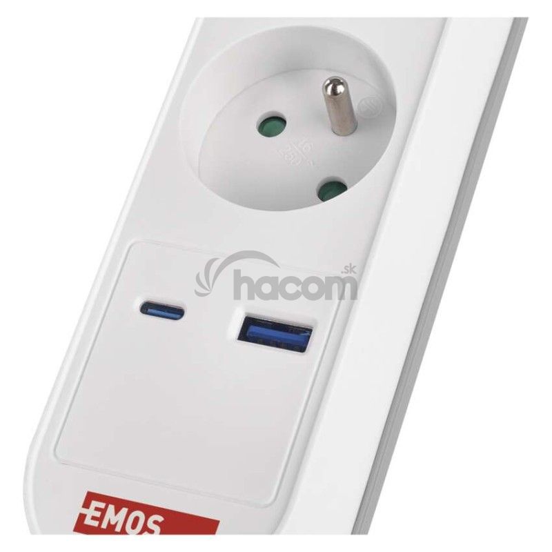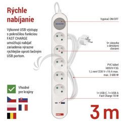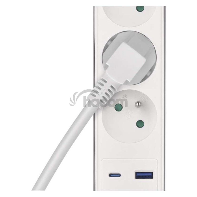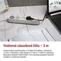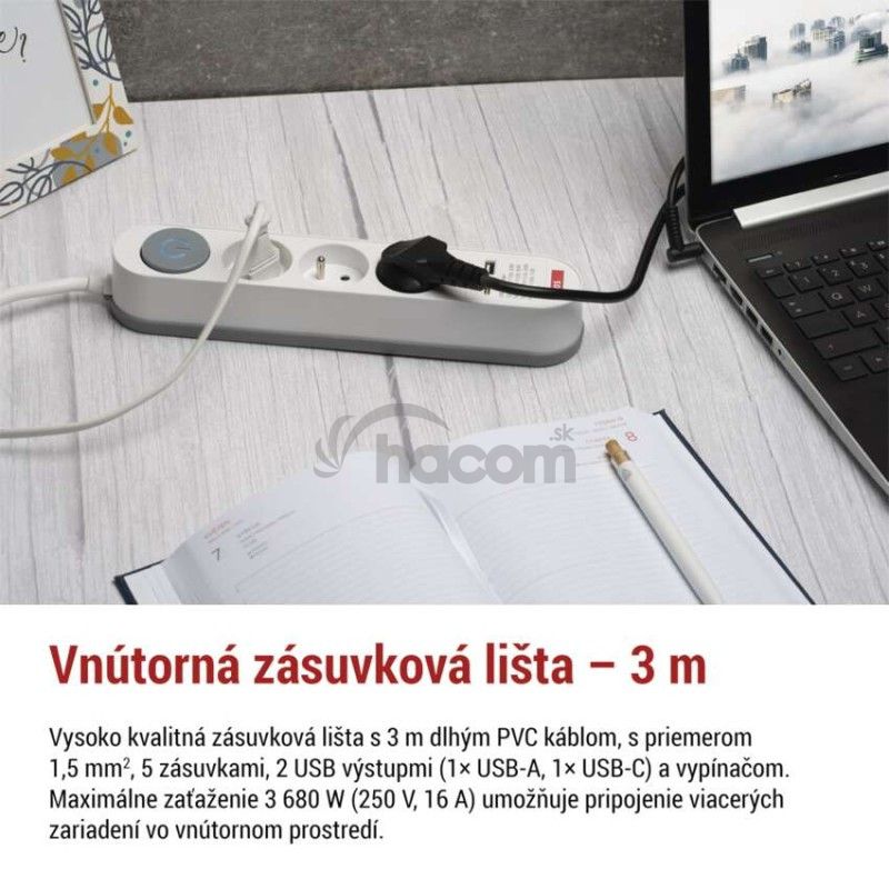 - Predlžovací kábel 3 m / 5 zásuvky / s vypínačom / bielo-sivý / 1×USB-A + 1×USB-C / 1,5 mm2 P1513FC