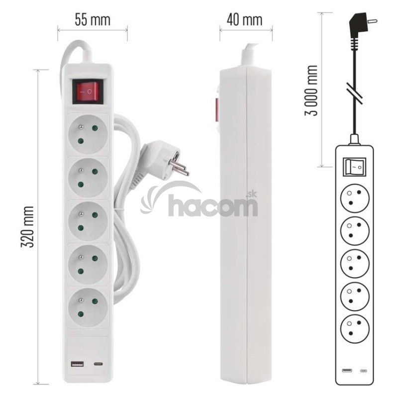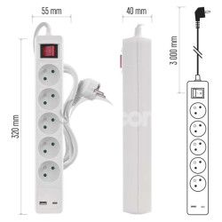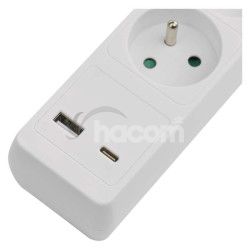 - Predlžovací kábel 3 m / 5 zásuvky / s vypínačom / biely / 1×USB-A + 1×USB-C / 1,5 mm2 P1513CU