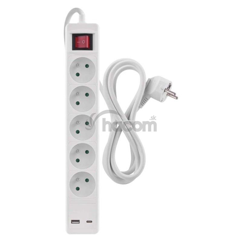 Predlžovací kábel 3 m / 5 zásuvky / s vypínačom / biely / 1×USB-A + 1×USB-C / 1,5 mm2 P1513CU