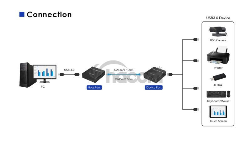 - Vysiela USB signál cez Cat5e/Cat6/Cat6A káble až na vzdialenosť 100m.