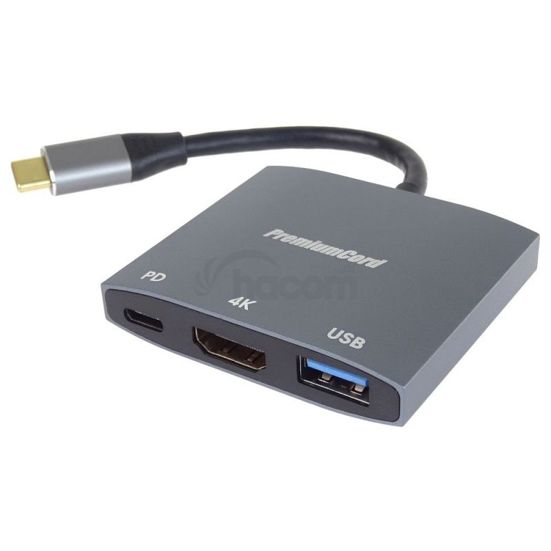 PremiumCord adaptér USB-C na HDMI, USB3.0, PD, rozlíšenie 4K a FULL HD 1080pTento adaptér umožňuje vysoko kvalitný prevod videa z USB-C konektora na HDMI monitor/TV/projektor. Funguje ako externá grafická karta s výstupom HDMI a USB.