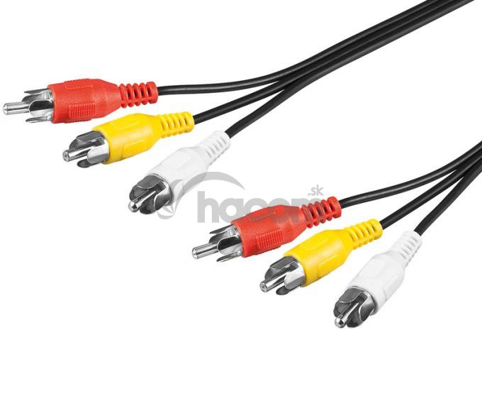 Kábel na spojenie dvoch audio zariadení zvukovým signálom stereo kvality. Na oboch stranách sú 3 konektory RCA (cinch). Kábel je v čiernej farbe.konektory: