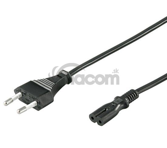 Napájací kábel v čiernom prevedení pre napájací adaptér. Dvojžilový kábel je zakončený koncom v podobe ležatej osmičky.Prvý konektor: Euro male (Type C CEE 7/16)
