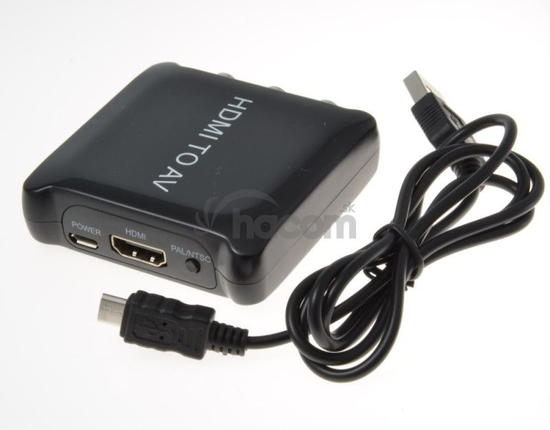 - Prevodník umožňuje prepojiť zariadenie s výstupným signálom HDMI na zobrazovacie zariadenie alebo TV, monitor s kompozitným signálom (žltý konektor) a stereo audio (BIELY + ČERVENÝ CINCH)