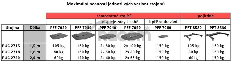 Stojiny slúžia na spojenie podlahových podstavcov (pojazdných, nepojazdných alebo na priskrutkovanie do podlahy) a adaptérov na uchytenie jedného alebo viacerých displejov vedľa seba, nad sebou alebo chrbtom k sebe. Dodávajú sa v dĺžkach 150, 180 a 200 cm.Hlavné vlastnosti